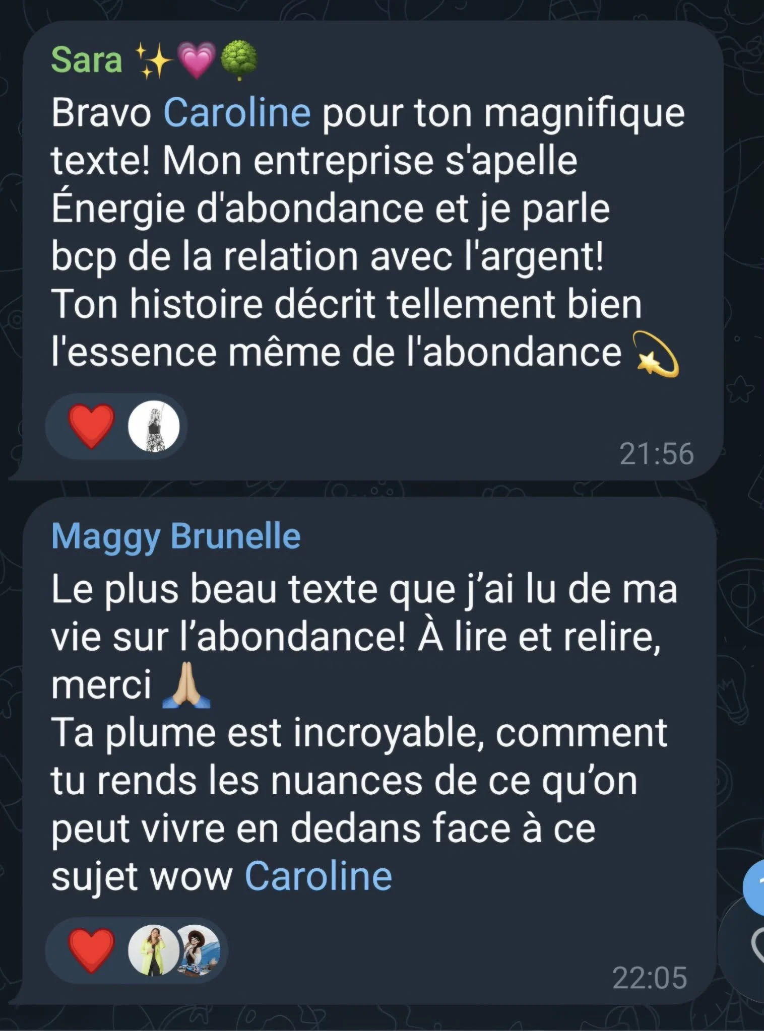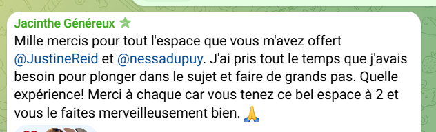 JUSTINE : Chez les auteurs, c’est une sortie de zone de confort, un plongeon puissant dans leur monde intérieur et une détermination à offrir une transformation grâce aux mots. Des opportunités qui se sont offertes à eux, de la guérison interne, des connexions de cœur entre eux et plus encore j’en suis certaine.