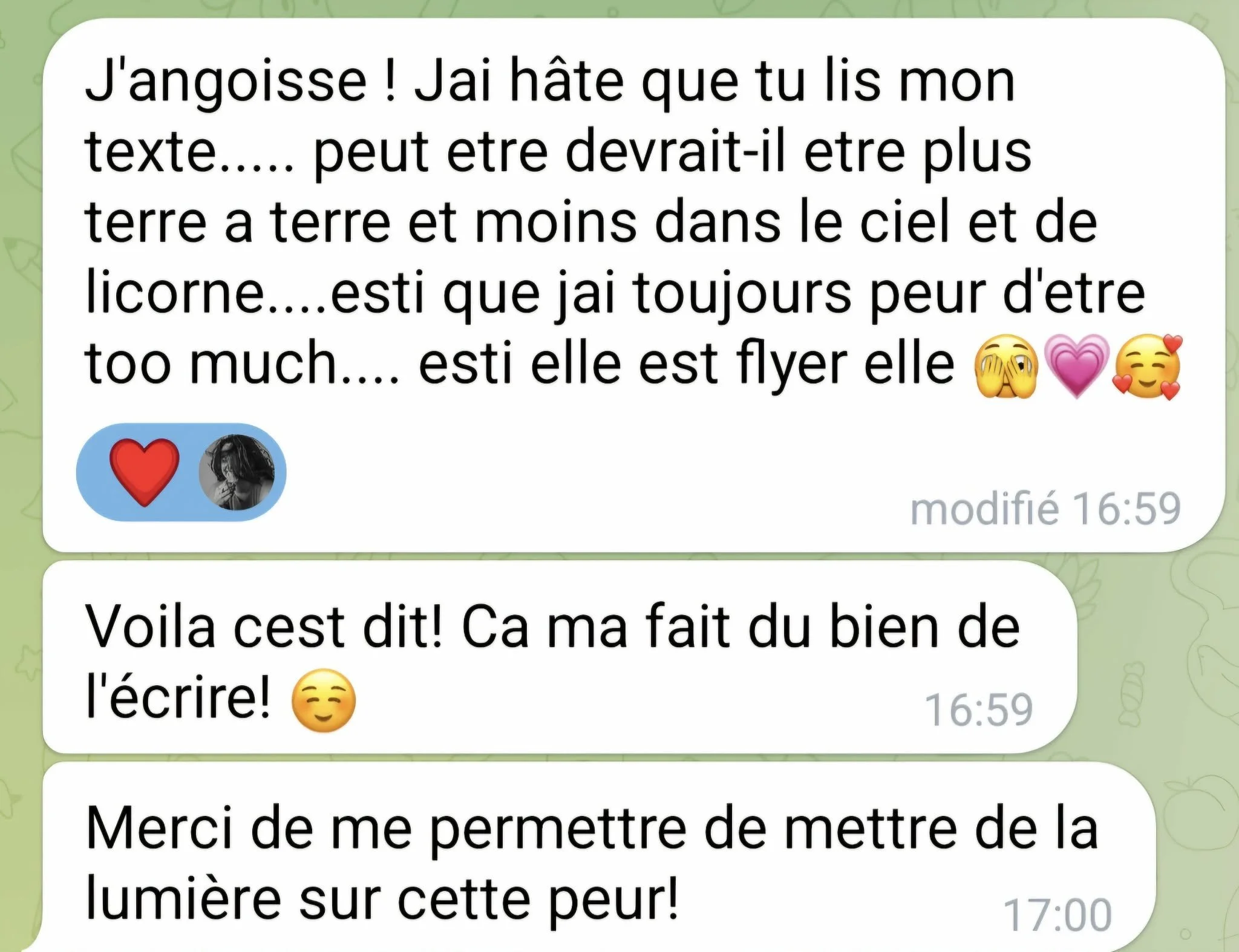 NESSA: L’écriture de mon texte a été un vrai défi. J’avais beaucoup, beaucoup de choses à raconter mais je ne savais pas du tout par quel bout m’y prendre. J'ai recommencé mon texte au moins trois fois. J’avais l’impression de raconter pleins de détails inutiles. Mais dès que j’en ai parlé avec Justine, les idées ont coulé de source. Elle a déclenché en moi une inspiration infinie ! J’ai même dû me restreindre pour ne pas écrire un livre 😆.