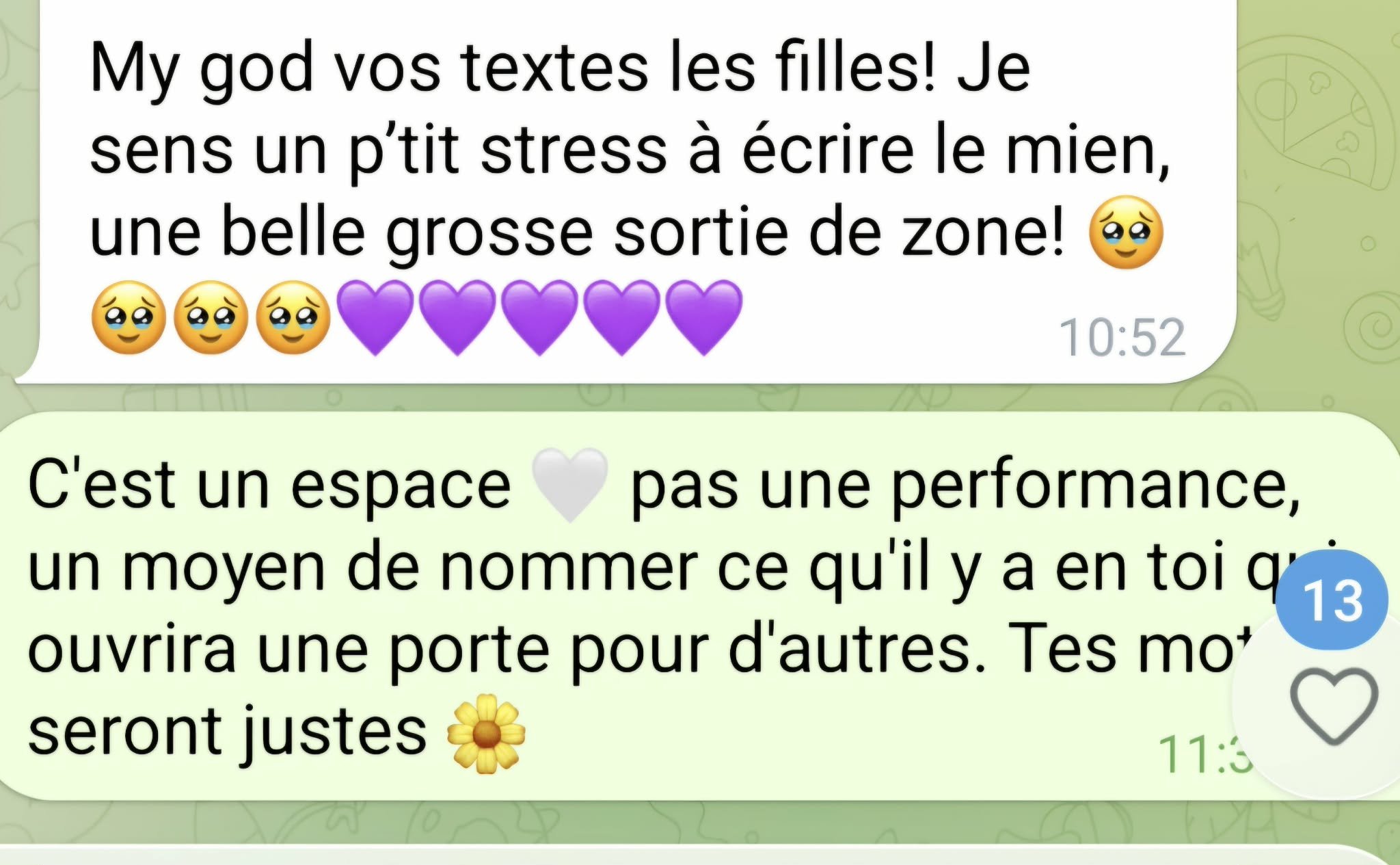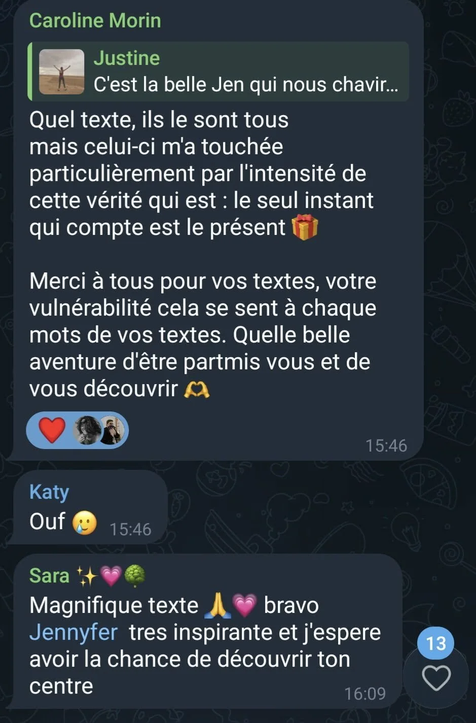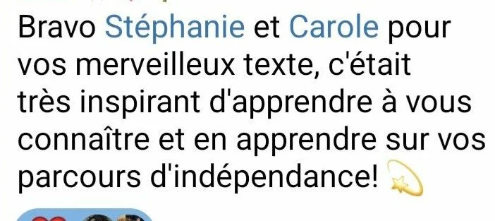 JUSTINE : Depuis le début décembre, c’est dans l’arrière-scène 30 humains qui ont plongé en eux, qui ont relevé le défi d’écrire alors que certains mon dit “je suis pas bon(ne) moi pour écrire!”. Alors que d’autres portaient des étiquettes d’être “mauvais en français”... Que d’autres avaient peur d’être vus.