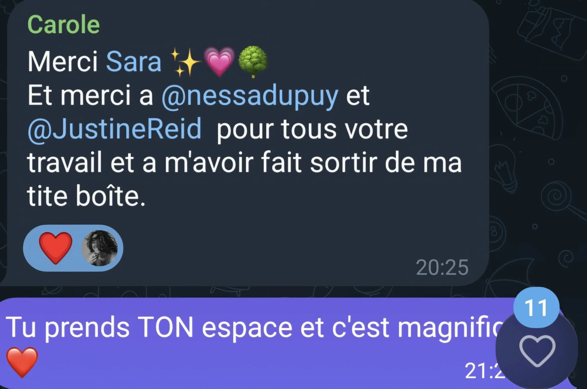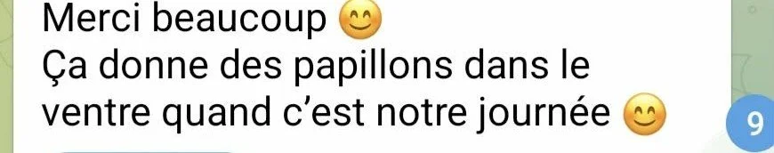 NESSA : Je crochetais quand soudain mon cellulaire se met à vibrer à l’infini. Je l’avais laissée pour une fois sur mon bureau loin de moi. Mais il vibrait tellement, que je me suis dit ce n’est pas possible, il va exploser !!! Je me rends et là que vois-je ? La belle Justine qui m'envoie DES vocaux. Pas un, pas deux, 18 millions ! Je me dis Ouh la la, il doit se passer de quoi ! Finalement j’écoute le premier vocal : une idée !!!! J’écoute tous ses vocaux en laissant aller mon sacral : est-ce qu’il a pris feu ? Ouiiiii ! Ce fut donc ma réponse à Justine.