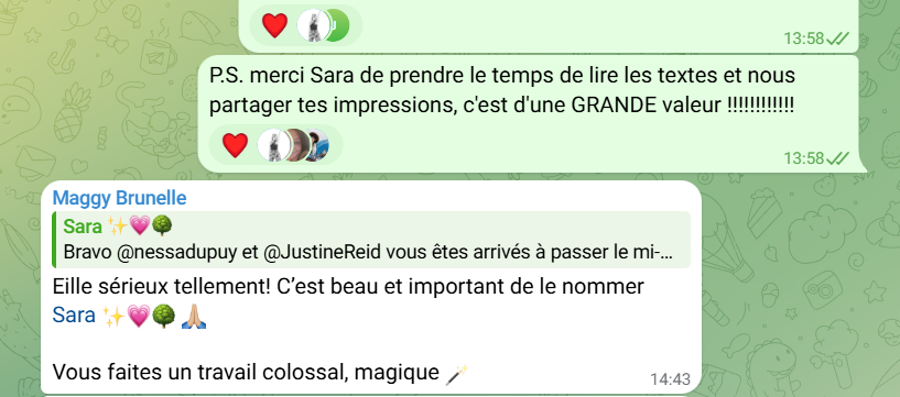 NESSA : Sans oublier le soutien merveilleux que chaque écrivain(e) s’apportait dans notre canal commun de discussion. Chaque jour je voyais passer des commentaires sur les textes de chacun, ça a fait tout chaud dans mon petit cœur tout mou.